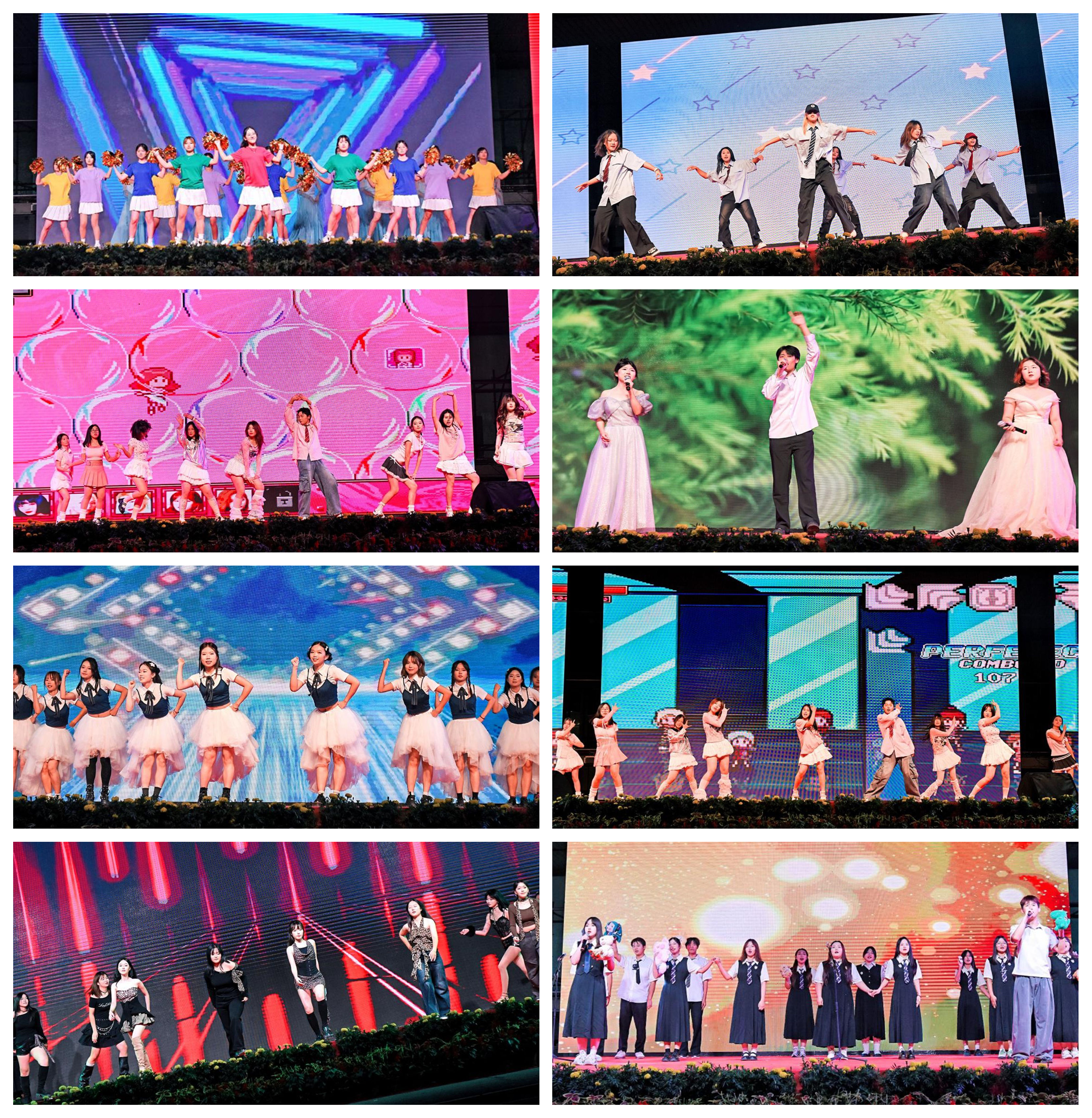 歌曲联唱环节温情与动感并存:教师刘一丁、王志坚携手献唱《苹果香》,醇厚嗓音传递生活诗意;西校区学子用《天后》《背对背拥抱》等流行金曲串联青春共鸣,《像风一样》《鲜花live》更以live现场的热烈质感唱响新生对未来的憧憬。