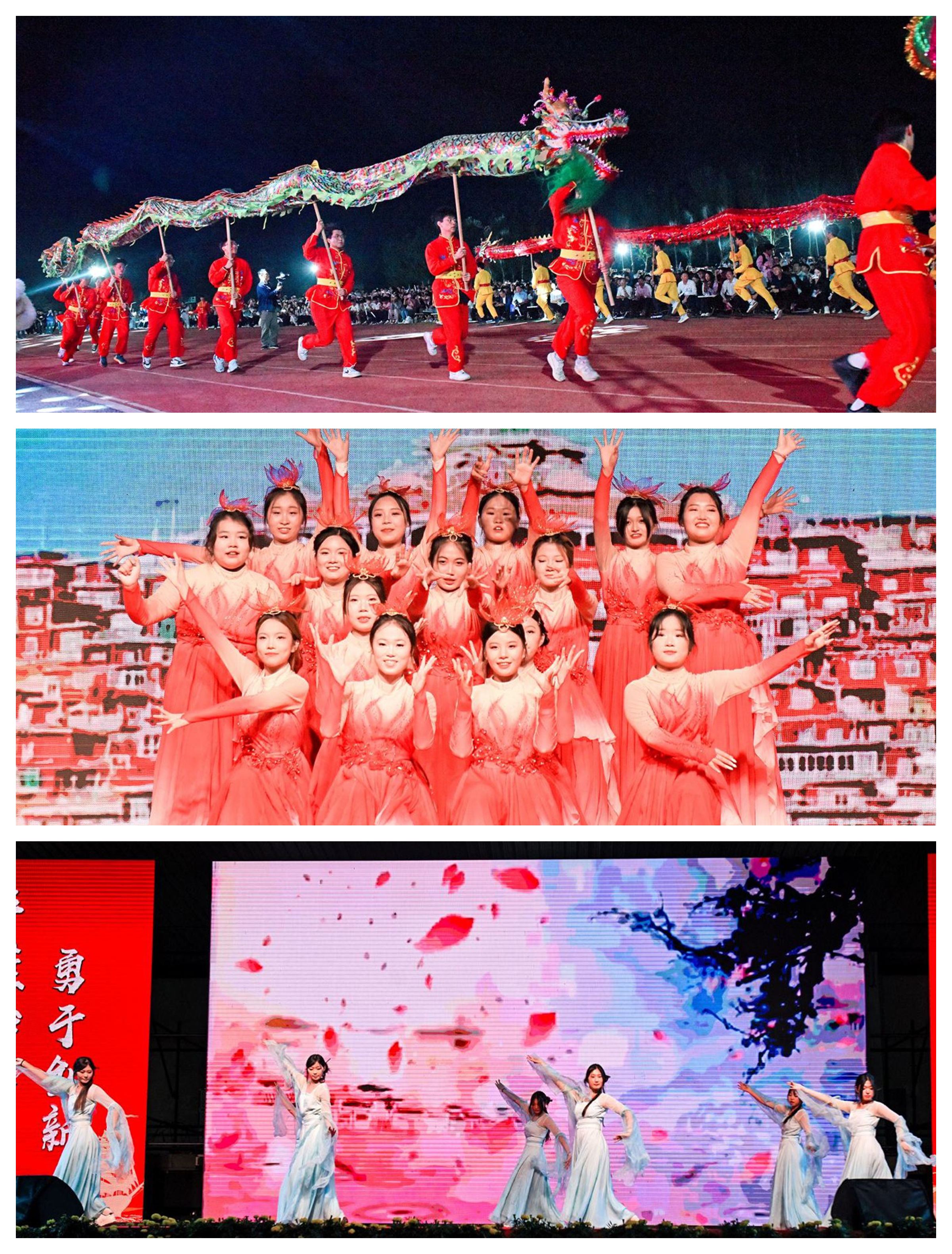 舞蹈串烧融合多元艺术表达:动漫社《次元回声》以二次元舞步唤醒“Z世代”文化记忆;西校区民族舞《古韵·新章》用水袖、折扇演绎传统美学,中国舞《美丽中国》则以舒展舞姿绘就山河画卷。全体新生辅导员集体朗诵《以爱为炬,伴你逐梦》,更以温暖声线传递师者关怀——“从今天起,我们是同路人”的承诺,为新生注入安心的前行力量。