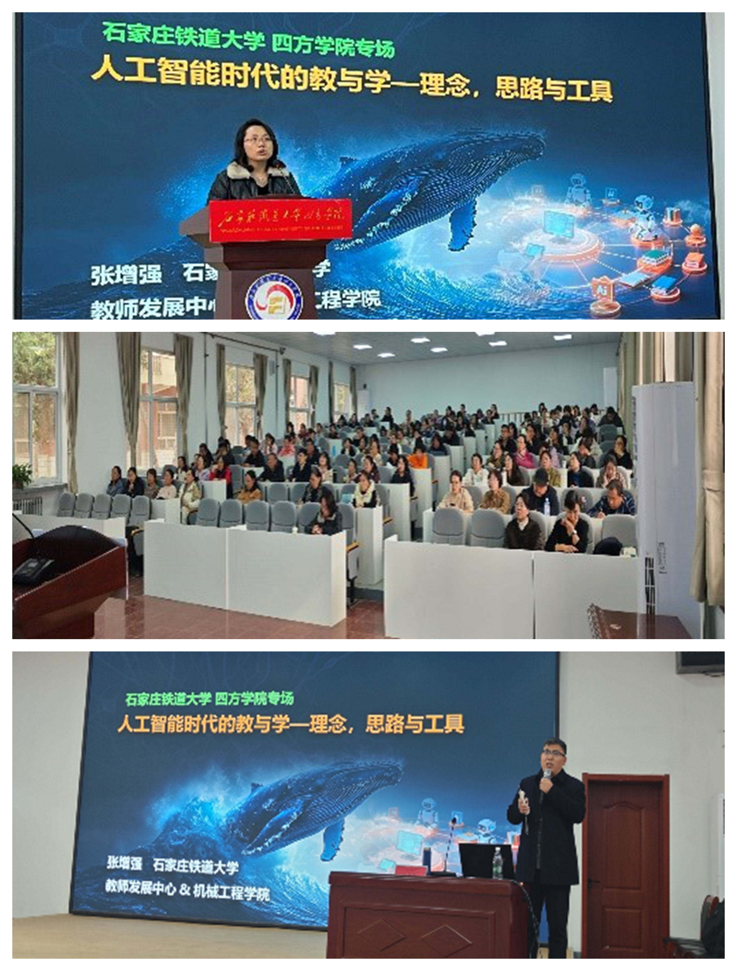 为主动应对人工智能技术对高等教育带来的机遇与挑战,深化教育教学改革,11月12日下午,我院特邀石家庄铁道大学张增强副教授在乡村振兴工作站多功能厅作题为《人工智能时代的教与学—理念,思路与工具》的专题讲座。讲座由副院长徐红主持,全院教师到场聆听。