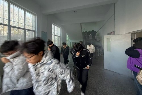 实操阶段,现场模拟真实火情场景,工作人员精准投放烟雾、拉响消防报警器,现场工作人员协同引导,全体师生按照预定疏散路线,快速、有序撤离至大操场安全区域,整个疏散过程规范高效、未出现拥挤混乱情况。