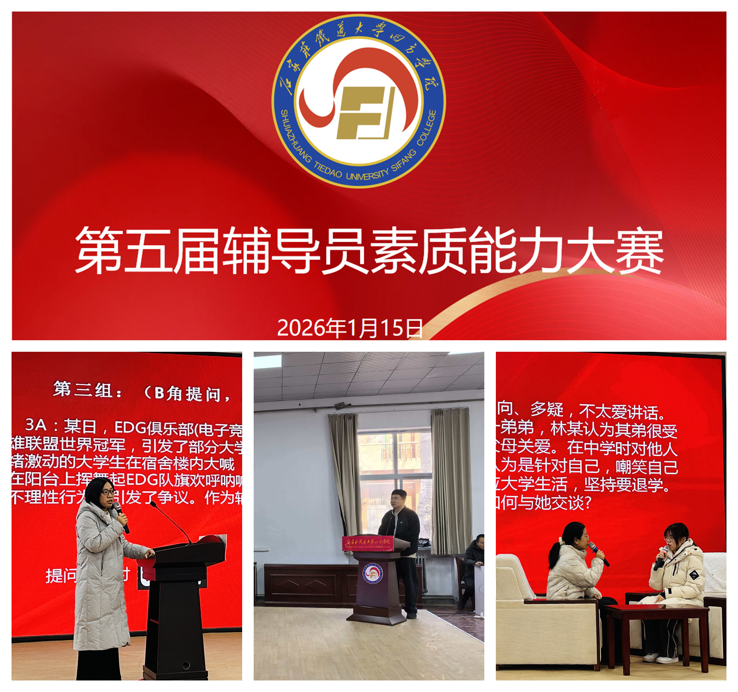 为深入推进辅导员队伍专业化、职业化发展,全面提升育人本领,2026年1月15日,石家庄铁道大学四方学院第五届辅导员素质能力大赛在南校区乡村振兴报告厅成功举办。学院两校区全体辅导员齐聚赛场,以赛促学、以赛代练,充分展现了新时代高校辅导员的专业素养与精神风貌。
